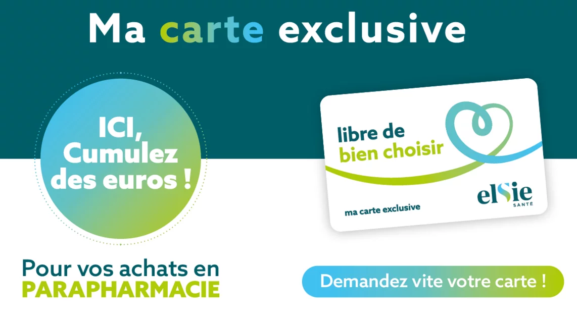 En tant que pharmacie membre du groupement Elsie Santé, la Pharmacie Mollien vous permet aussi de profiter de la carte exclusive Elsie Santé. Cette carte de fidélité vous offre la possibilité de cumuler des euros sur vos achats en parapharmacie et de bénéficier d’avantages réguliers tout au long de l’année. Simple et gratuite, elle vous permet d’optimiser vos achats tout en profitant de conseils professionnels pour choisir les produits les plus adaptés à vos besoins. N’hésitez pas à la demander directement à l’équipe lors de votre prochaine visite à la pharmacie.